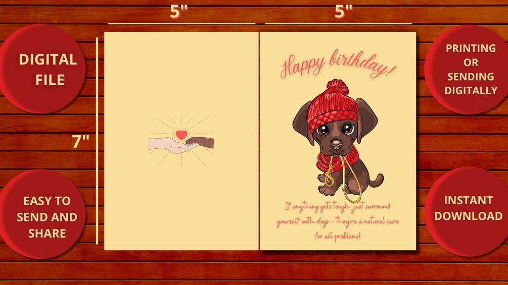 Enjoy the original and charming birthday card with dog motifs! This digital card comes in PDF and JPG format, making it easy to print or send via email. It is ideal for anyone who loves dogs and wants to express their love and attention on their birthday. Purchase this product now and share your joy and warm message with your beloved friend or family member who loves dogs.