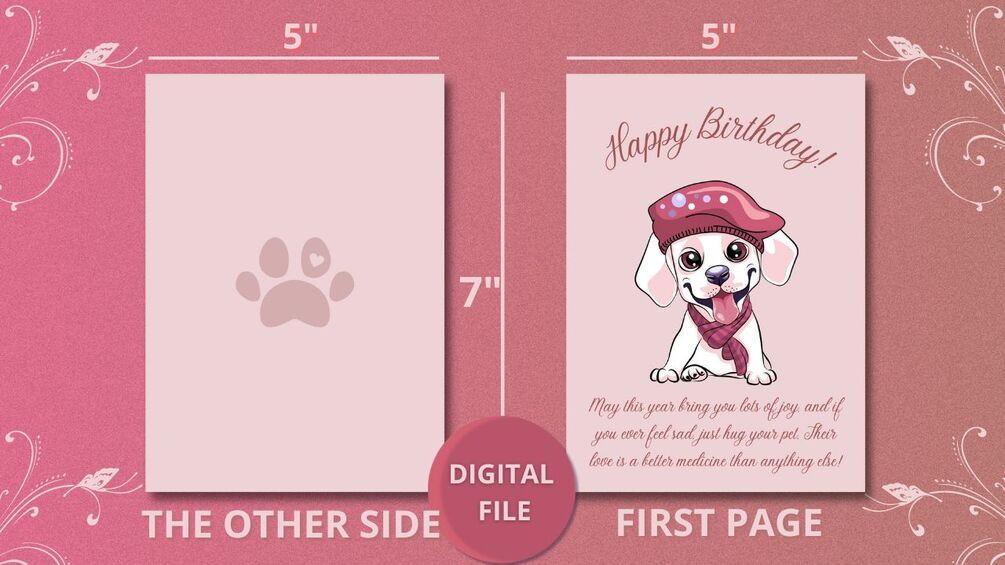 Enjoy the original and charming birthday card with dog motifs! This digital card comes in PDF and JPG format, making it easy to print or send via email. It is ideal for anyone who loves dogs and wants to express their love and attention on their birthday. Purchase this product now and share your joy and warm message with your beloved friend or family member who loves dogs.